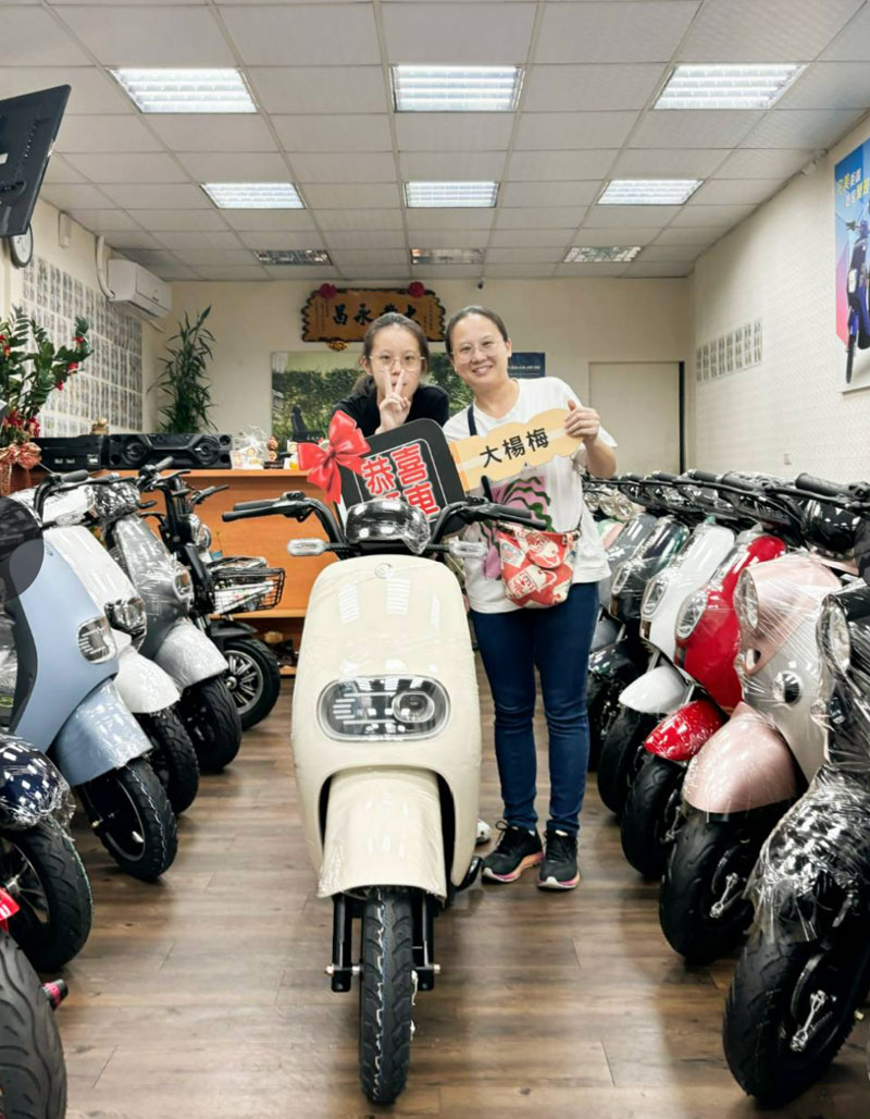 林先生疼惜老婆每日走路去上班,若要上街購物都須搭公車,非常不方便;故今日全家特地蒞店賞車,要選購一部優質的微型電動二輪車送給心愛的老婆,經店長詳細介紹後,發現此款車外型亮麗、重量輕巧好駕控,馬力足、動能優越、車廂空間大、坐墊又舒適,可可米的配色加尾箱,非常漂亮,林太太很是喜歡;所以立馬成為最佳首選,感謝你們對本店的信賴與支持。恭喜囉!